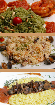 Risotto con camarones cocinado con vino blanco, queso gorgonzola, mascarpone y nueces.